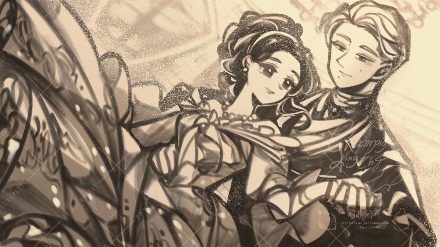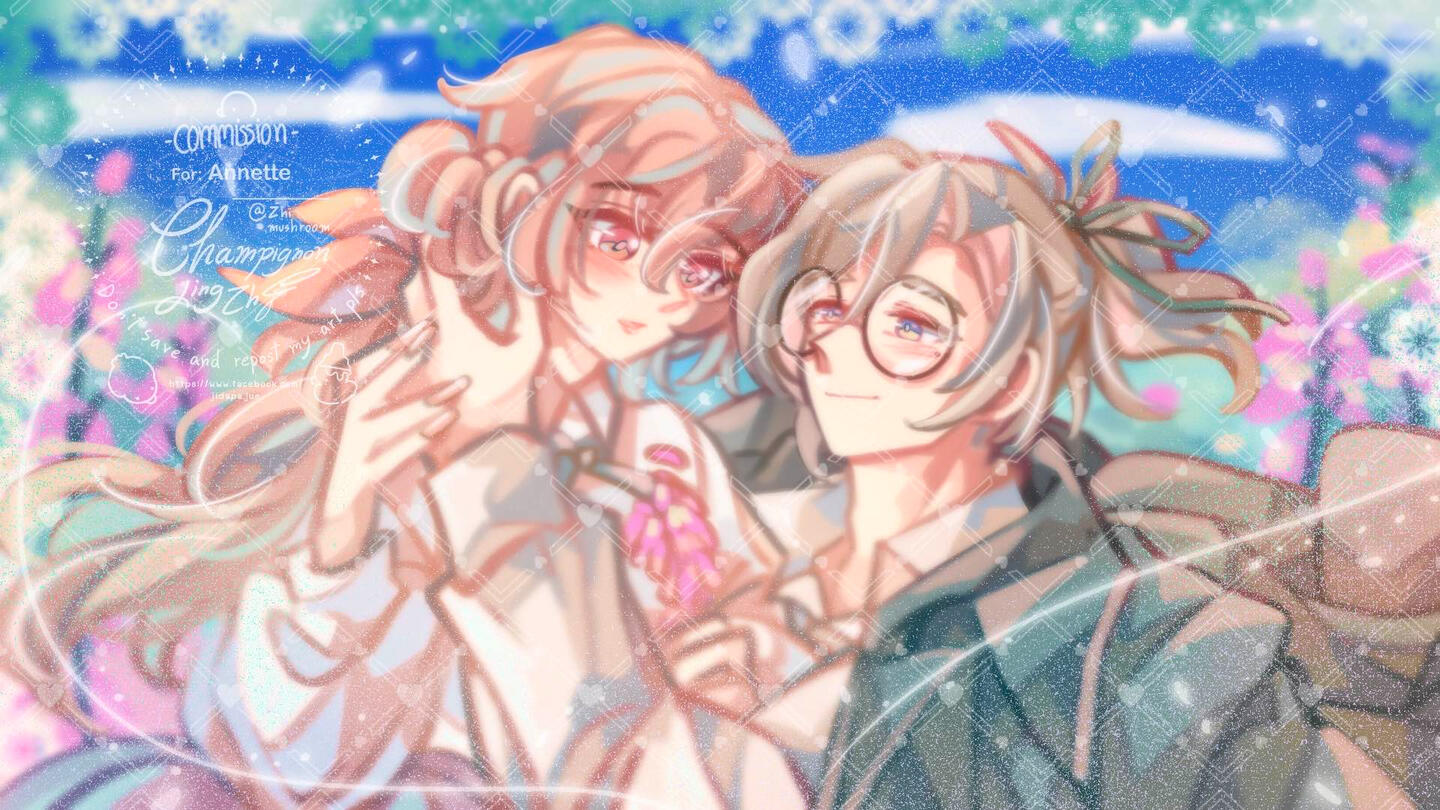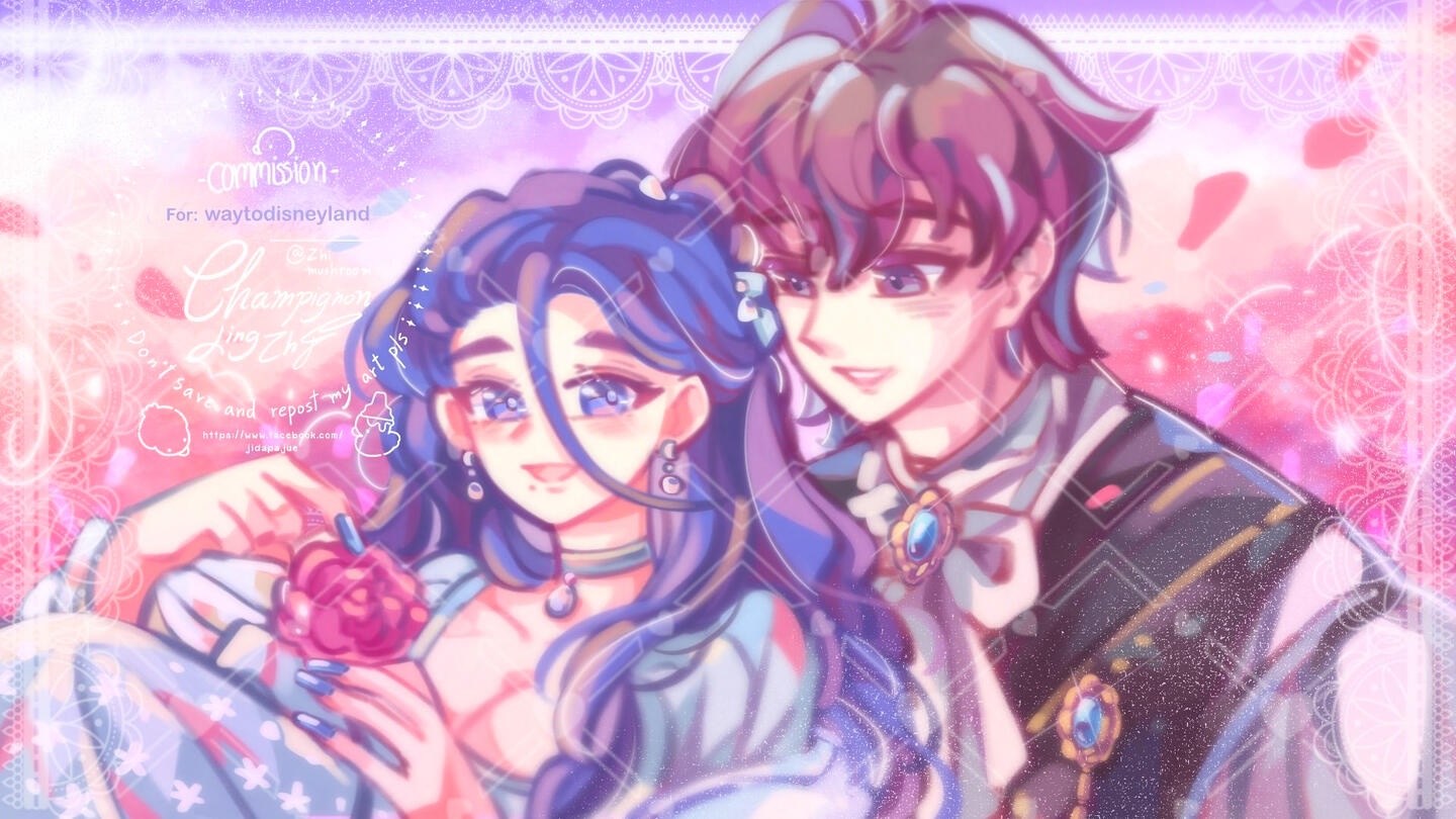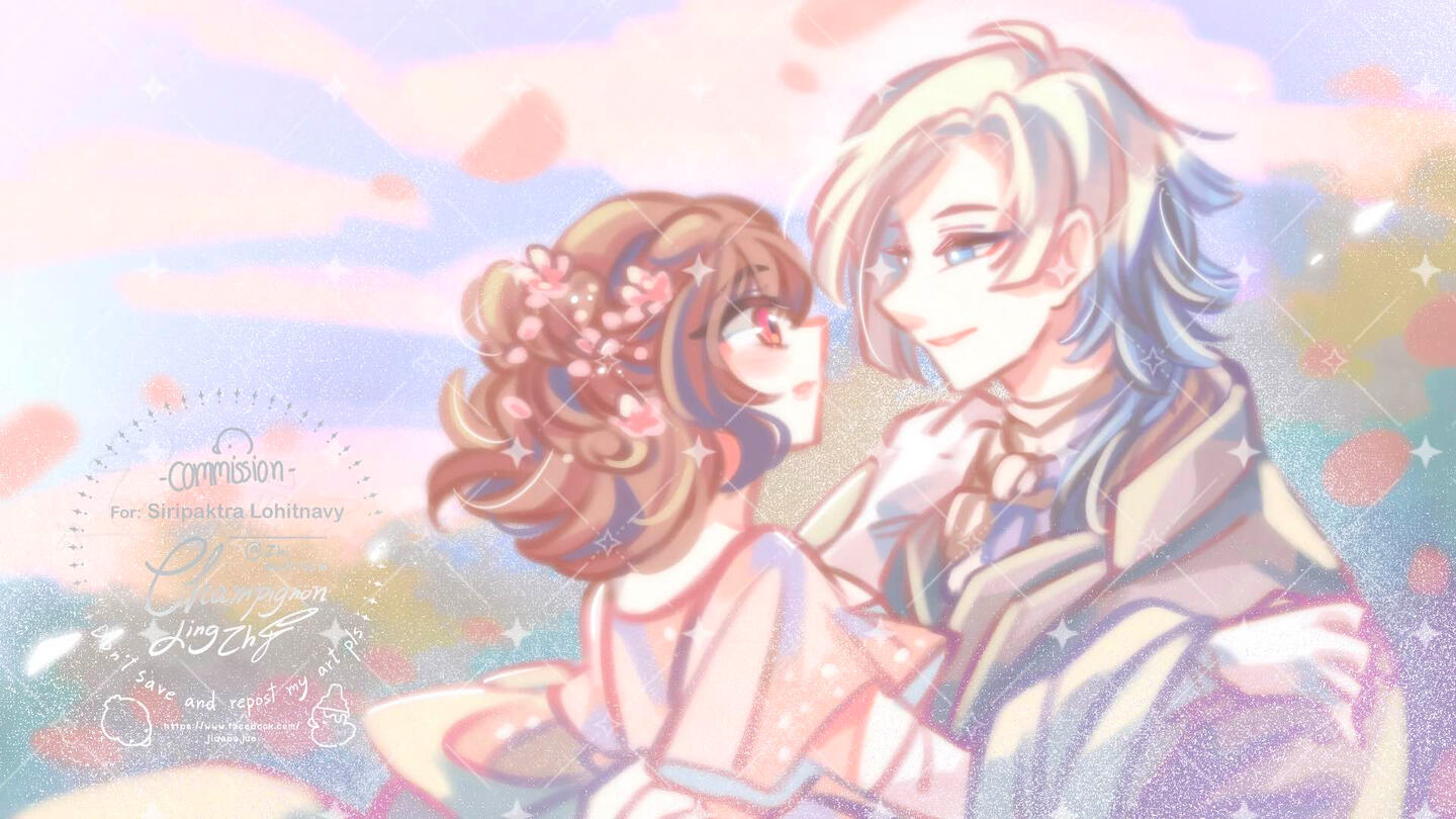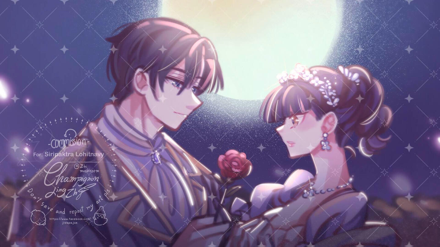 สเกลครึ่งตัว A กับ B เดินจับมือกัน มืออีกข้างของAโอบไหล่B ส่วนมืออีกข้างของBจิ้มแก้มA ทั้งคู่หันหน้ามองกันสายตาและรอยยิ้มกว้างให้กันและกัน ฉากหลังเป็นสวนดอกกุหลาบสีแดงกับขาว ท้องฟ้าบรรยากาศสดใสมีโดมมีผีเสื้อ กระโปรง B พริ้วๆให้เห็นลวดลายตัวอย่างที่ได้