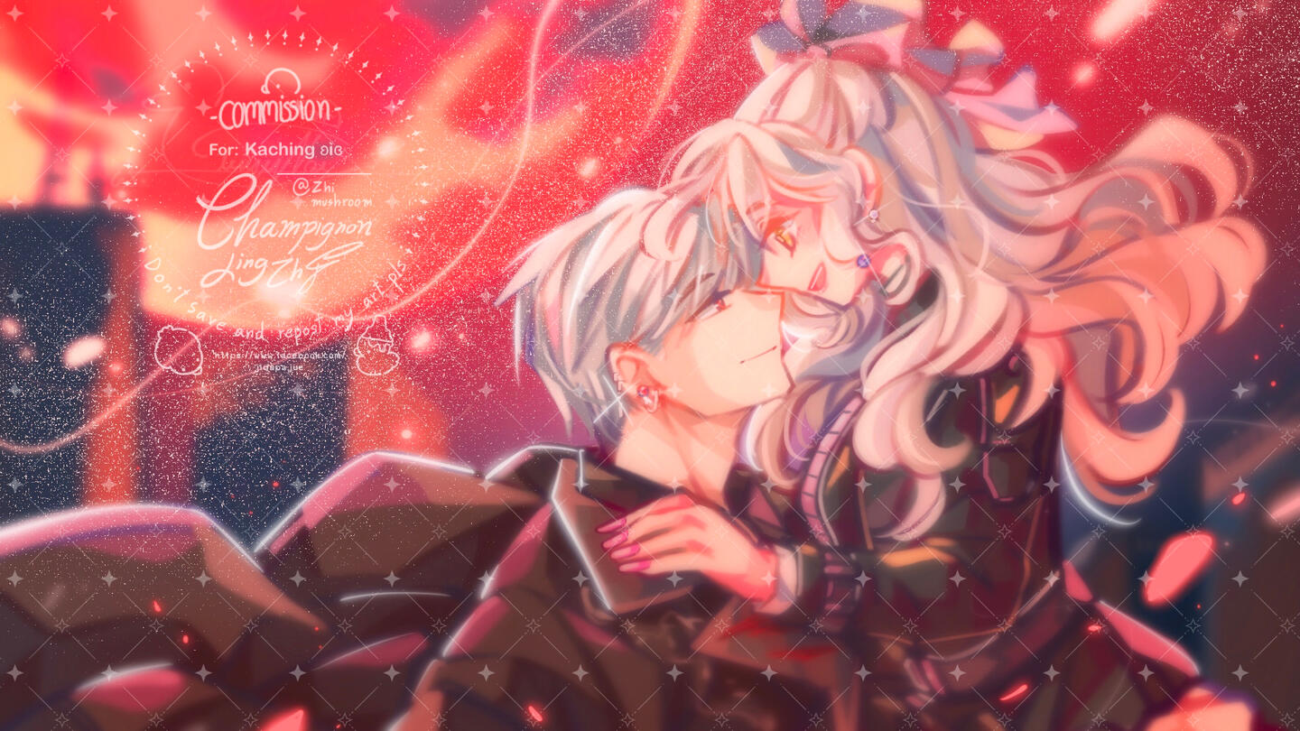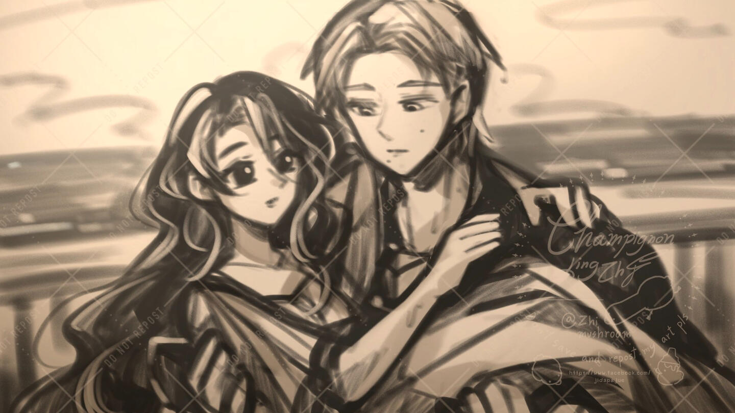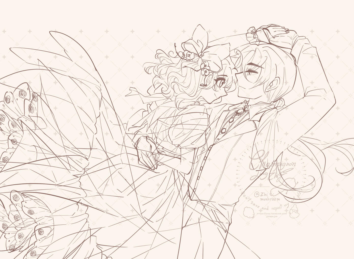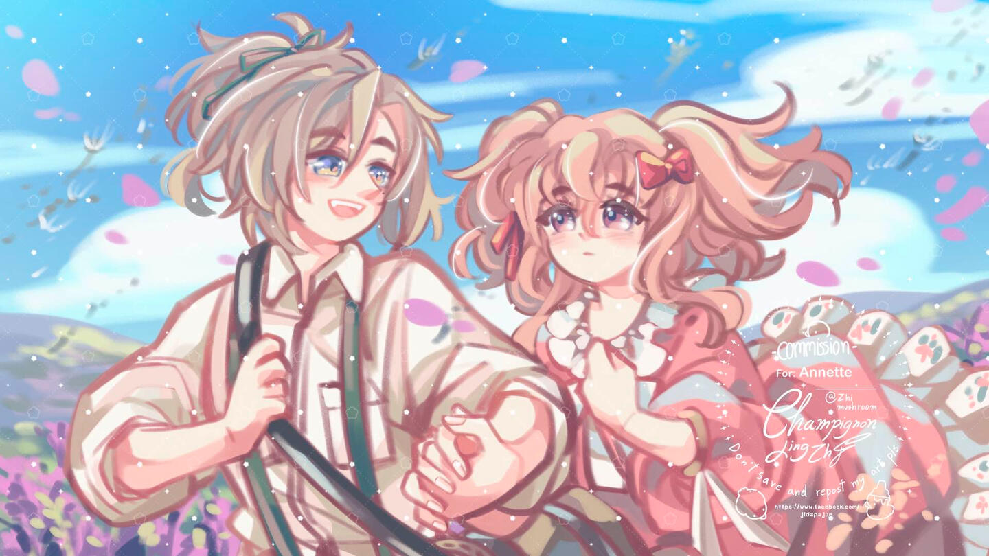 สเกลครึ่งตัว A กับ B เดินจับมือกัน มืออีกข้างของAโอบไหล่B ส่วนมืออีกข้างของBจิ้มแก้มA ทั้งคู่หันหน้ามองกันสายตาและรอยยิ้มกว้างให้กันและกัน ฉากหลังเป็นสวนดอกกุหลาบสีแดงกับขาว ท้องฟ้าบรรยากาศสดใสมีโดมมีผีเสื้อ กระโปรง B พริ้วๆให้เห็นลวดลายตัวอย่างที่ได้