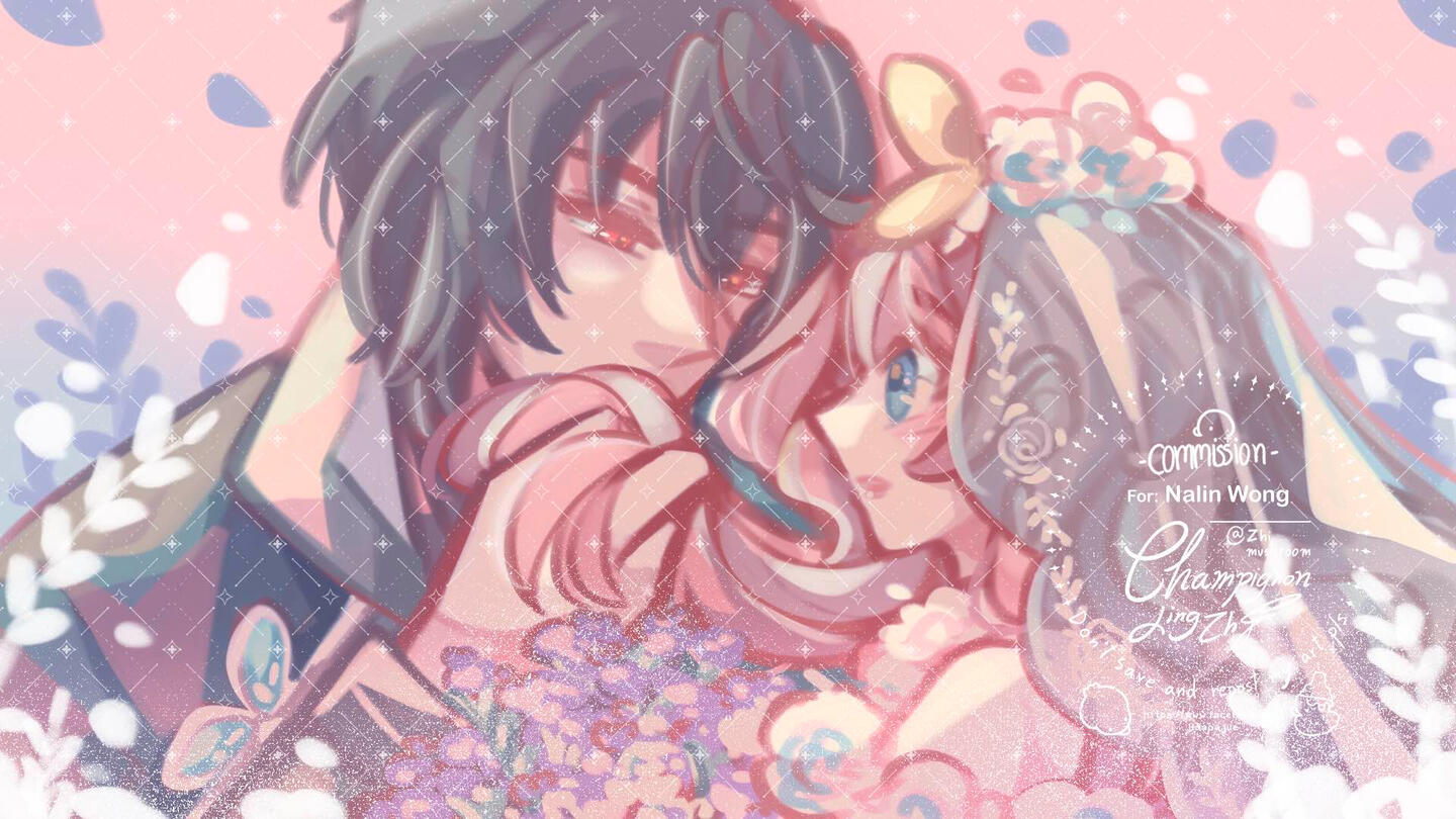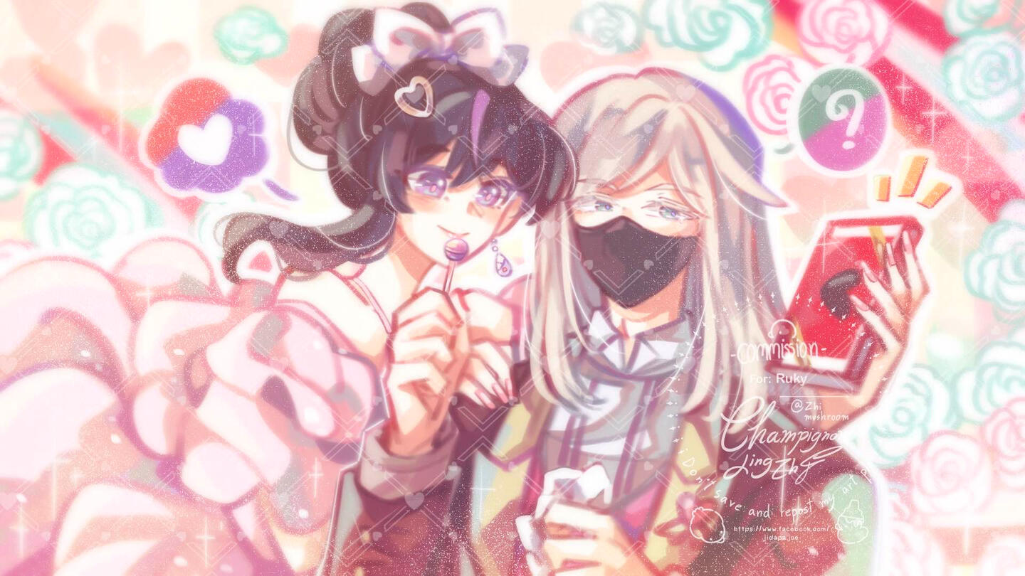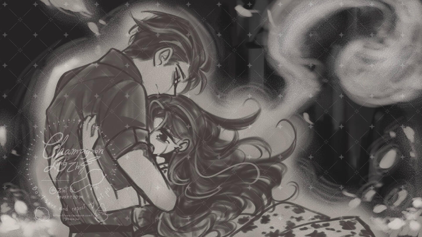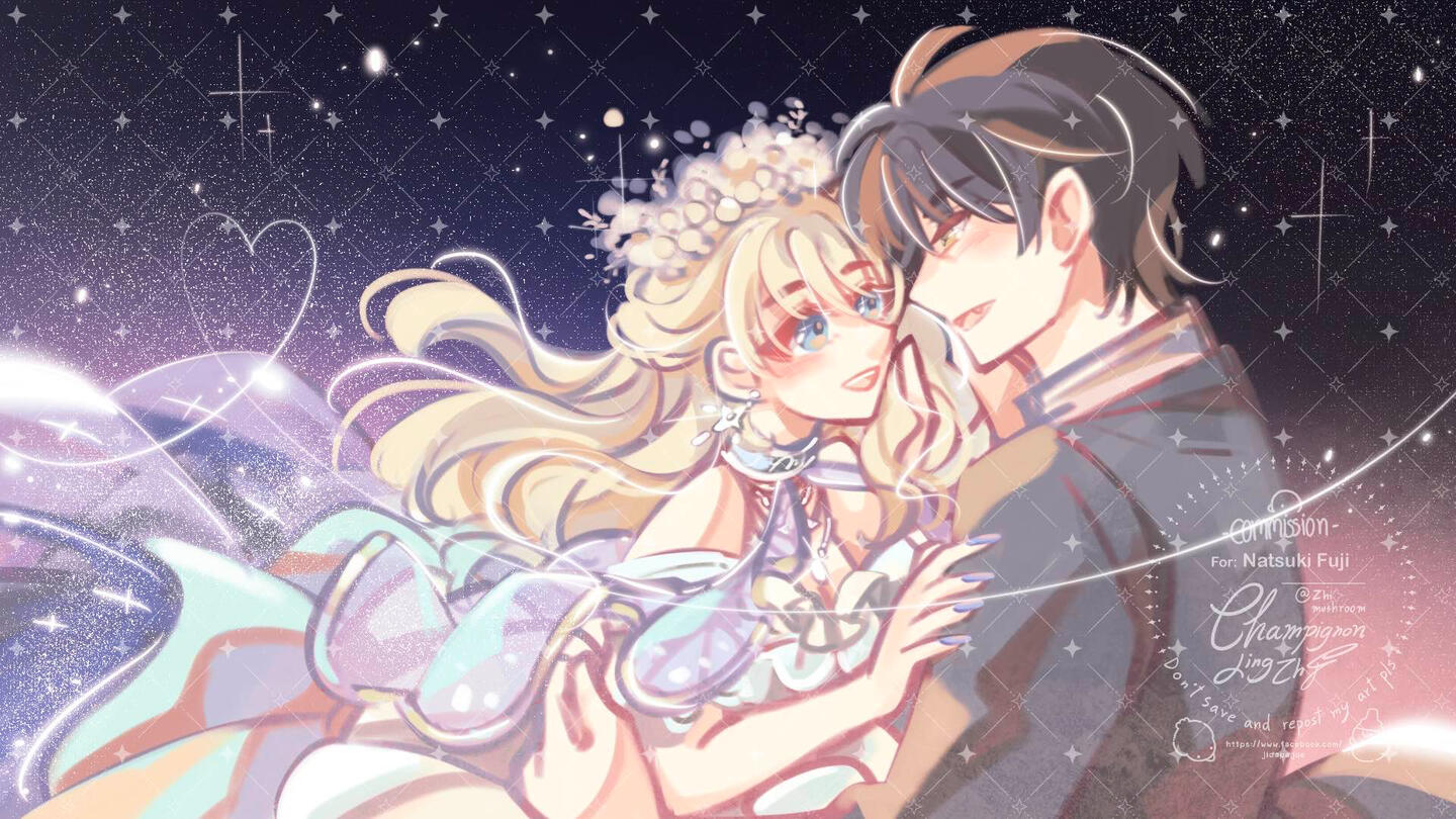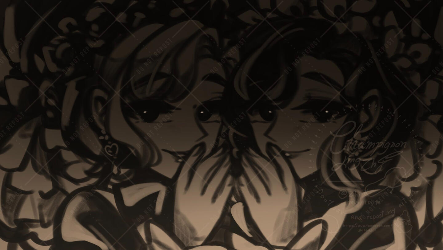สเกลครึ่งตัว A กับ B เดินจับมือกัน มืออีกข้างของAโอบไหล่B ส่วนมืออีกข้างของBจิ้มแก้มA ทั้งคู่หันหน้ามองกันสายตาและรอยยิ้มกว้างให้กันและกัน ฉากหลังเป็นสวนดอกกุหลาบสีแดงกับขาว ท้องฟ้าบรรยากาศสดใสมีโดมมีผีเสื้อ กระโปรง B พริ้วๆให้เห็นลวดลายตัวอย่างที่ได้