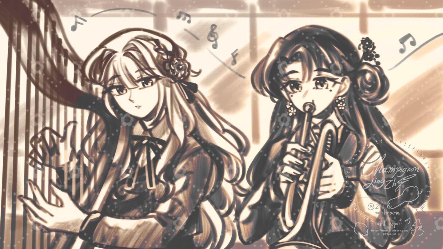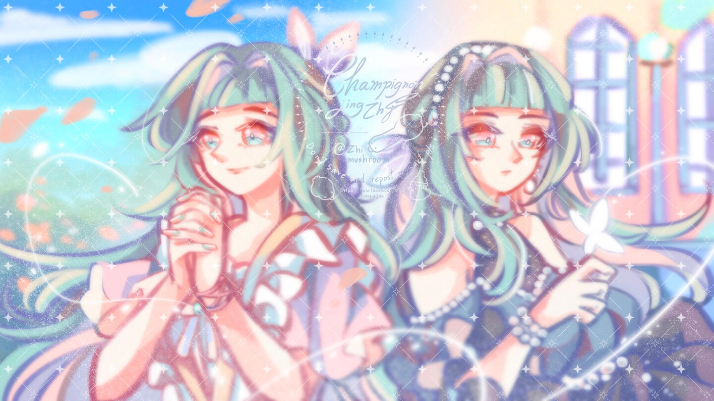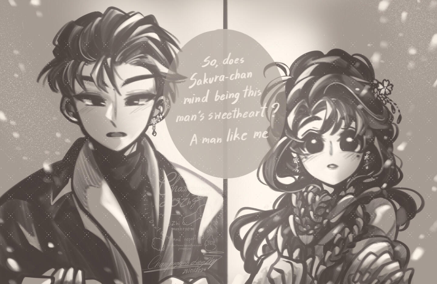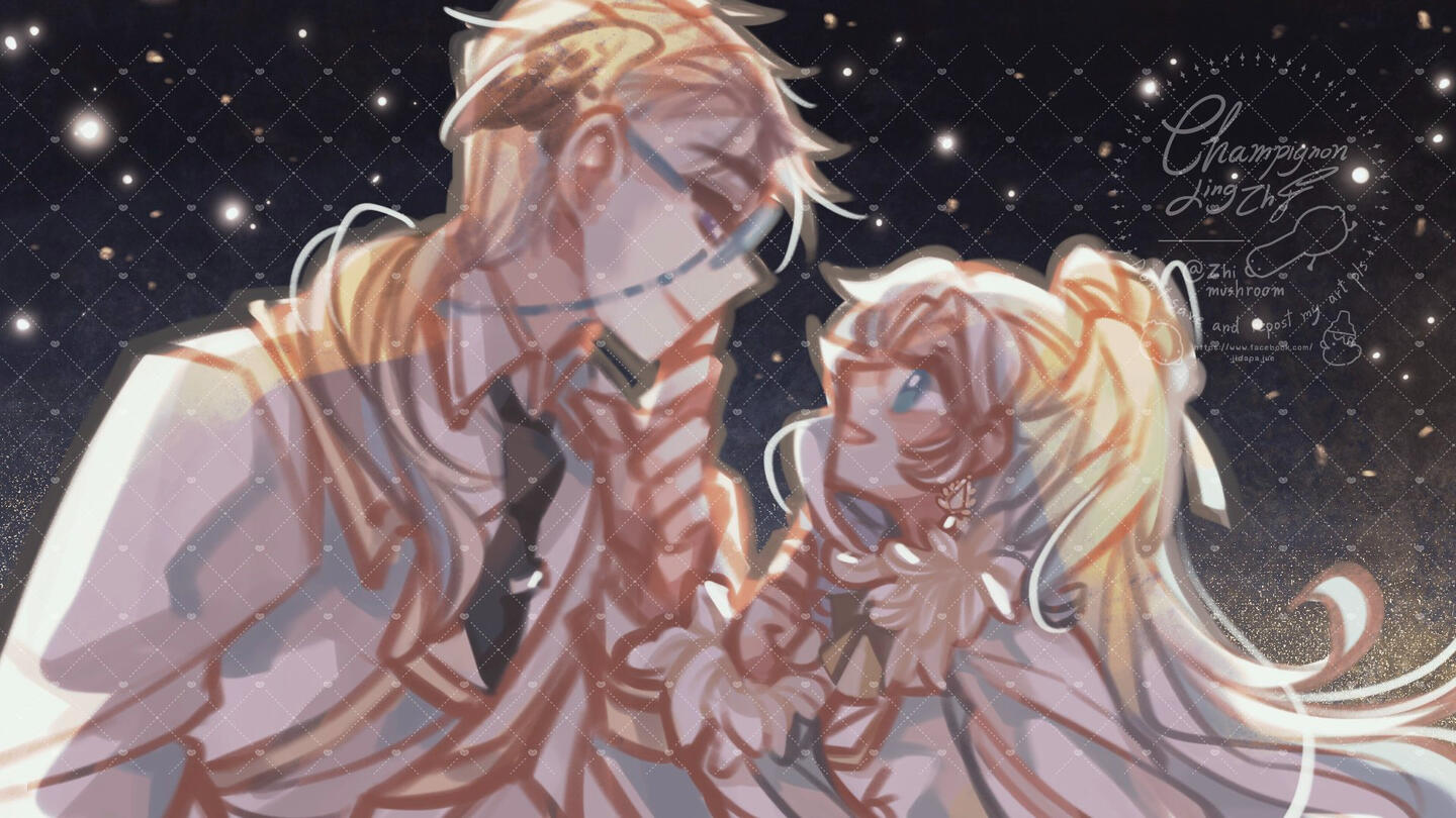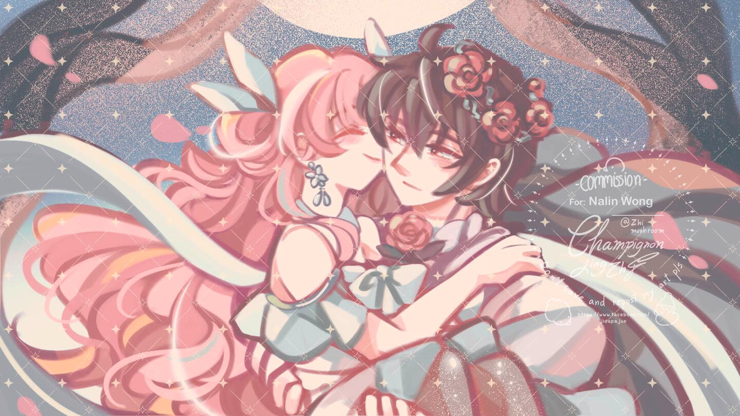 สเกลครึ่งตัว A กับ B เดินจับมือกัน มืออีกข้างของAโอบไหล่B ส่วนมืออีกข้างของBจิ้มแก้มA ทั้งคู่หันหน้ามองกันสายตาและรอยยิ้มกว้างให้กันและกัน ฉากหลังเป็นสวนดอกกุหลาบสีแดงกับขาว ท้องฟ้าบรรยากาศสดใสมีโดมมีผีเสื้อ กระโปรง B พริ้วๆให้เห็นลวดลายตัวอย่างที่ได้